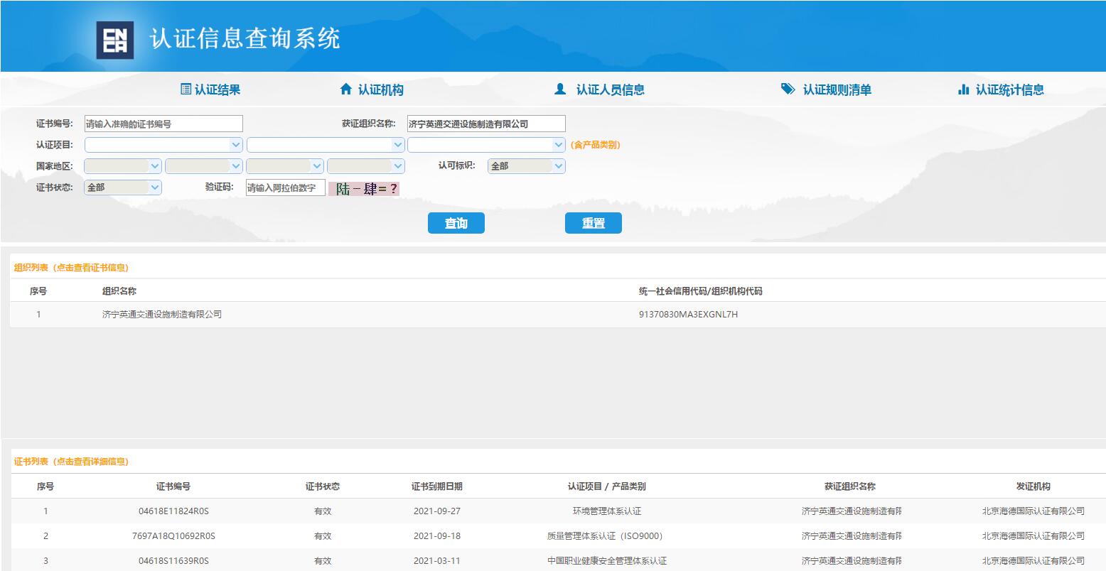 济宁英通交通设施制造有限公司三体系认证