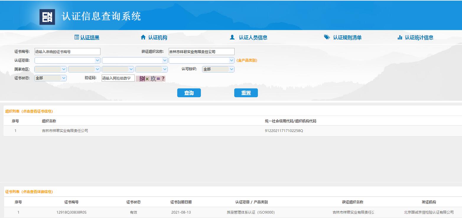 吉林市祥君实业有限责任公司质量认证