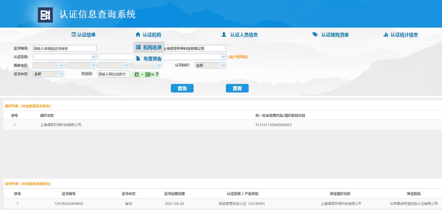 您的当前位置: 首页 >> 咨询业绩 >> 上海得恩环保科技有限公司质量认证